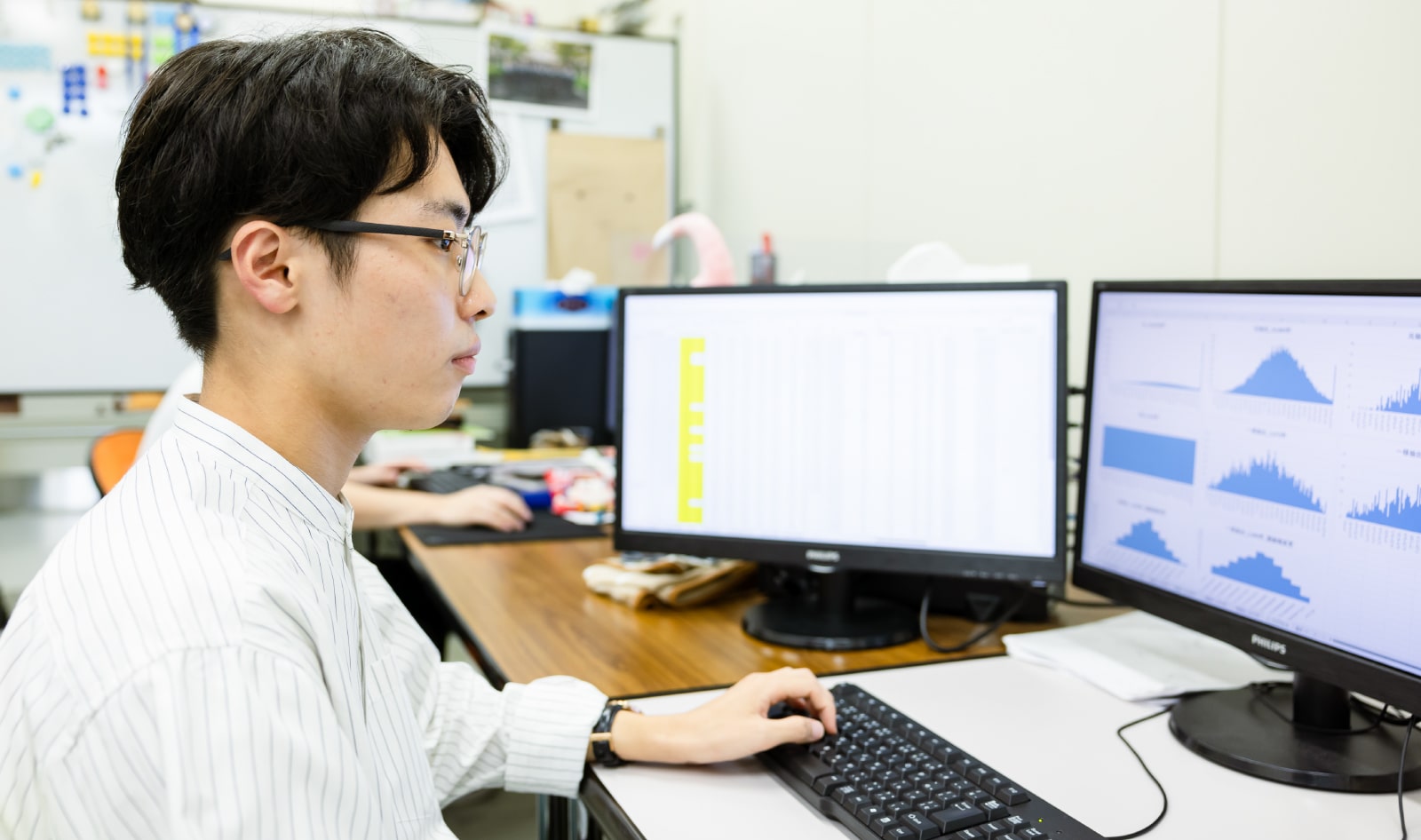 ものづくり全般に関心を持って研究に取り組み、常に新しい技術の探求に励んでいます。数字だけ見ていてもわかりづらいので、傾向をグラフに置き換えたり、図にプロットしてみたり、工夫のアイデアも必要です。共同研究先の企業とは月に一回程度ミーティングを行い、意見交換と課題解決を行っています。