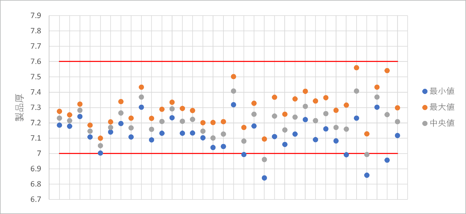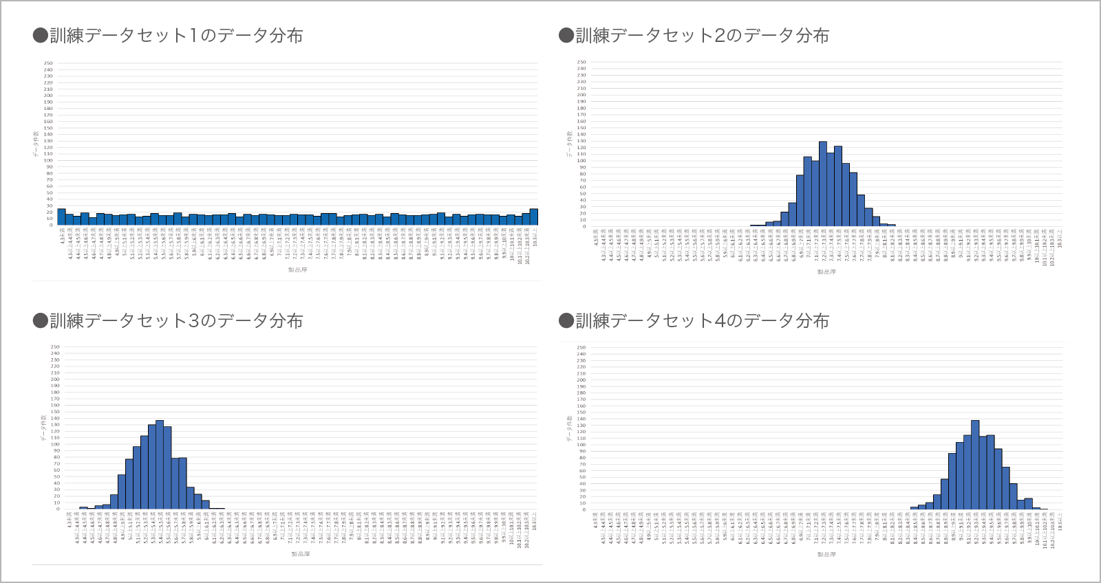 (下)アルゴリズムの精度を検証するための数値実験結果を図で表現したもの。横軸はAIに学習させるデータの種類。縦軸は求解した制御条件(製造機械の設定値)でシミュレーションして算出された製品の厚みを示しています。複数の厚みを算出しているため、そのうちの最大値、中央値、最小値をプロット。赤線は良品範囲で、赤線内の点が良品となり、赤線外の点が不良品となります。