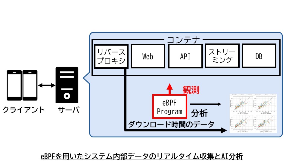 大規模システムでは、性能低下や障害の原因を特定することが困難です。当研究室では、システム内部の動作データをリアルタイムで収集し、AIを用いて性能劣化や障害の兆候を早期に発見する技術を研究しています。詳細なシステム監視技術やサーバ・ネットワーク異常検出技術を通じて、次世代の安定した情報基盤の実現を目指します。具体的には、eBPFと呼ばれるサーバ内部の動作や性能データをリアルタイムに取得できる仕組みを用いて、サーバの状態を取得・解析することで、高精度な異常検知および障害予兆検知を実現する技術の創出を目指しています。