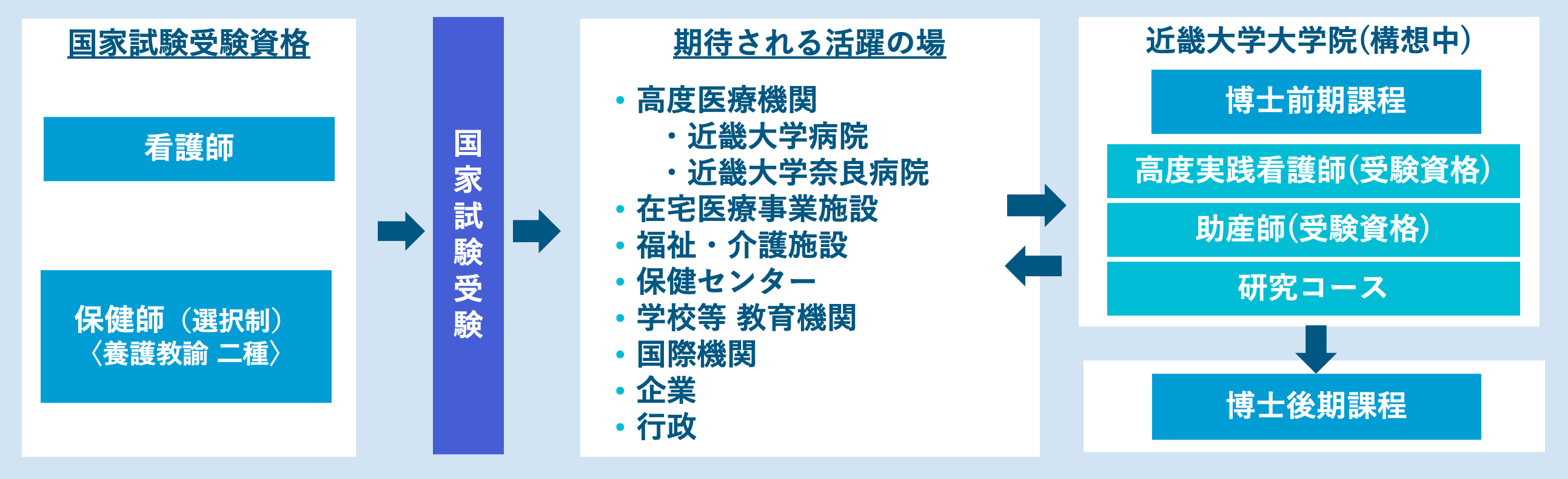 近畿大学看護学部看護学科の卒業生は、保健・医療・福祉等の幅広い現場で活躍が期待されます。 卒業後は、国家試験の合格後に看護師や保健師の国家資格を取得し、病院等に就職します。