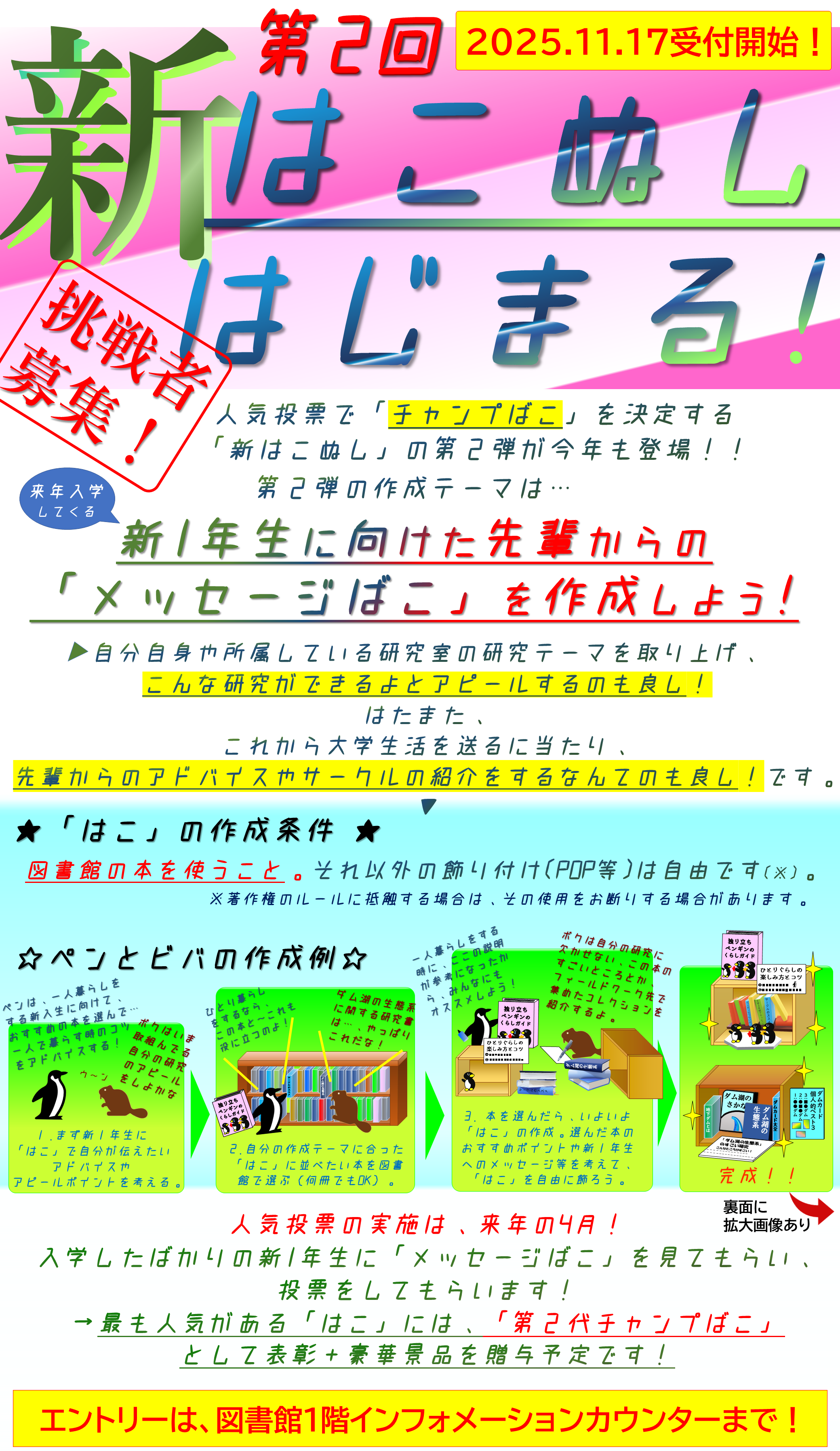 あらかじめ決められた選書ルールにしたがって、「はこ」を作成してもらい、 人気投票で1位となった「はこ」を、「チャンプはこ」として表彰する企画です。