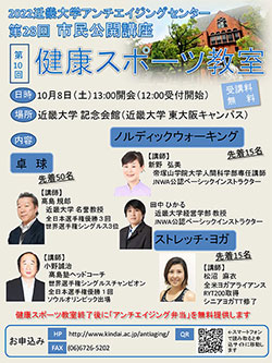 近畿大学アンチエイジングセンター(東大阪市小若江)は、令和4年(2022年)10月8日(土)東大阪キャンパス近畿大学記念会館にて、第28回市民公開講座(第10回健康スポーツ教室)を開催します。
