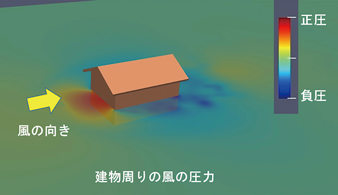 強風時の建物に作用する風圧力を、コンピューターシミュレーションで研究しています。風上側の壁面は正圧(押す力)が作用し、屋根面では負圧(引く力)が作用します。コンピューターシミュレーションを使うと建物に作用する風圧力が色で表すことができ、台風時の建物に作用する力が詳しくわかります。