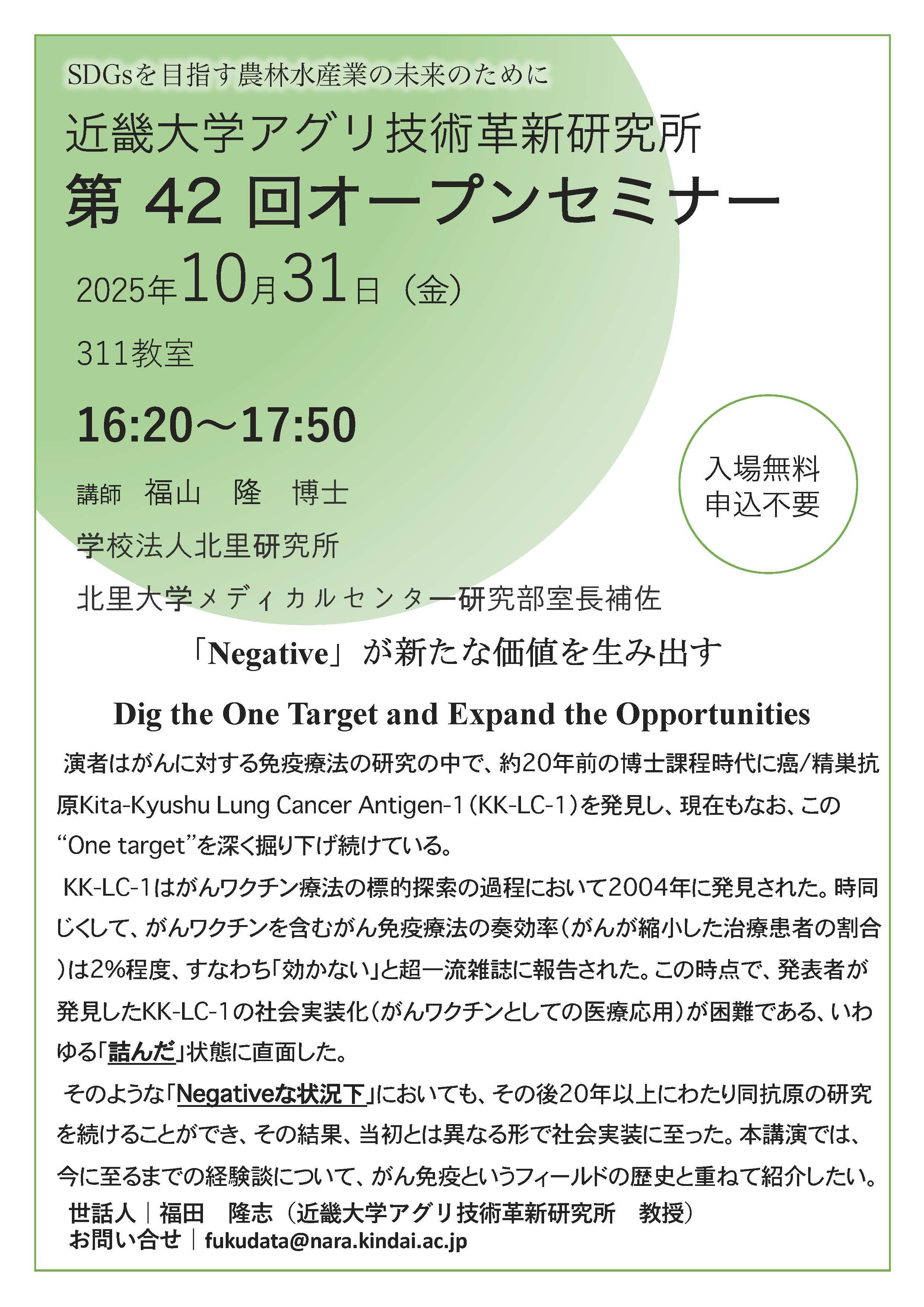 | 案内ポスター(PDF) | 近畿大学アグリ技術革新研究所第42回オープンセミナー | |