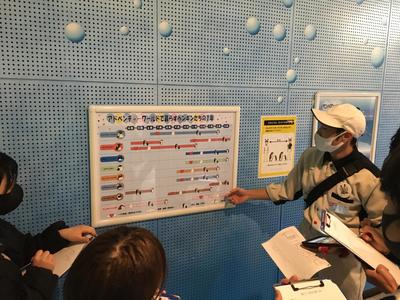 現地実習では、「ライオン・チーター」「ペンギン」「キリン」「イルカ」「ホッキョクグマ」「レッサーパンダ」「コツメカワウソ」の7つの班に分かれ、アドベンチャーワールドのスタッフのレクチャーのもと、飼育動物の生態観察や来場者調査を行いました。