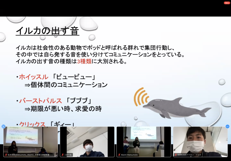 令和2年(2020年)12⽉12⽇に⾏った最終講義では、オンラインで参加するアドベンチャーワールドのスタッフに対し、学⽣グループがこれまでのアドベンチャーワールドでの現地実習や⾃らの調査内容をもとにプレゼンテーションを⾏いました。