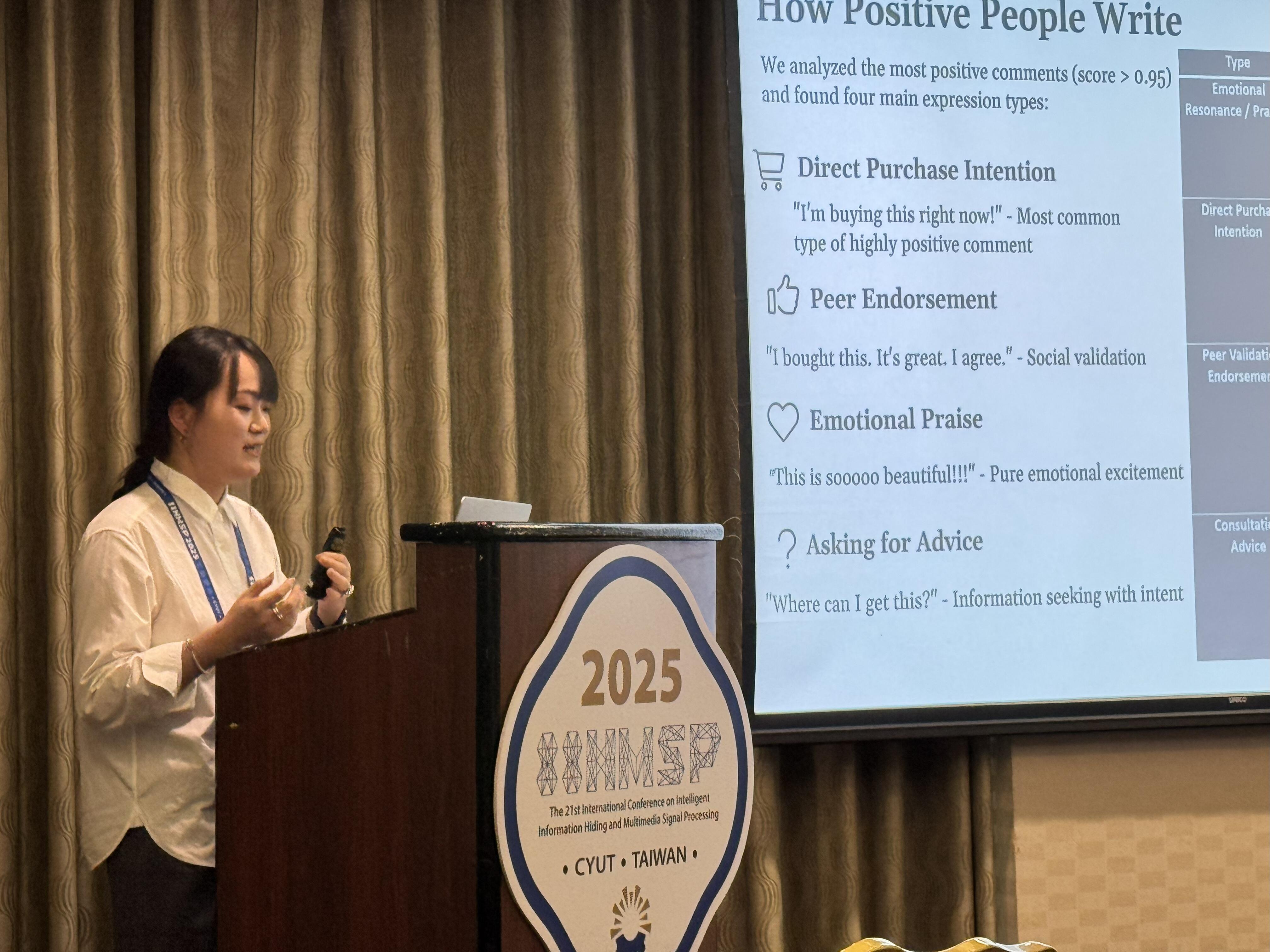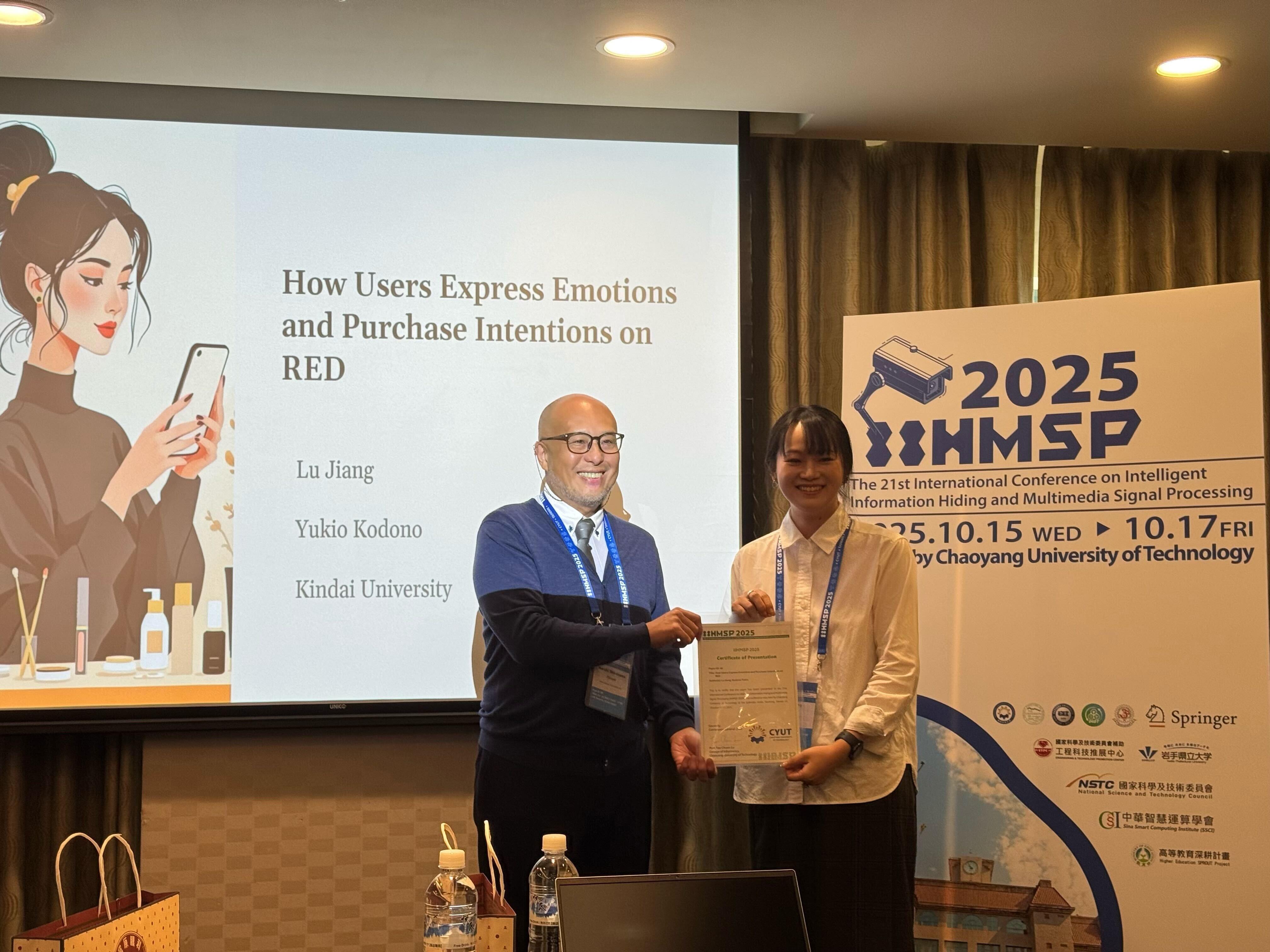 2025年10月15日から17日に開催されたThe 21st International Conference on Intelligent Information Hiding and Multimedia Signal Processing (IIHMSP 2025))において、商学研究科博士後期課程の蒋露さんと盧奕さんの研究論文がExcellent Paper Awardを受賞しました。
