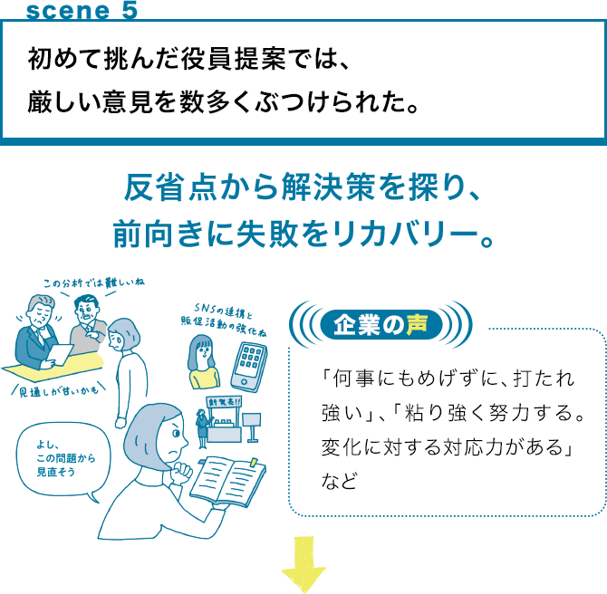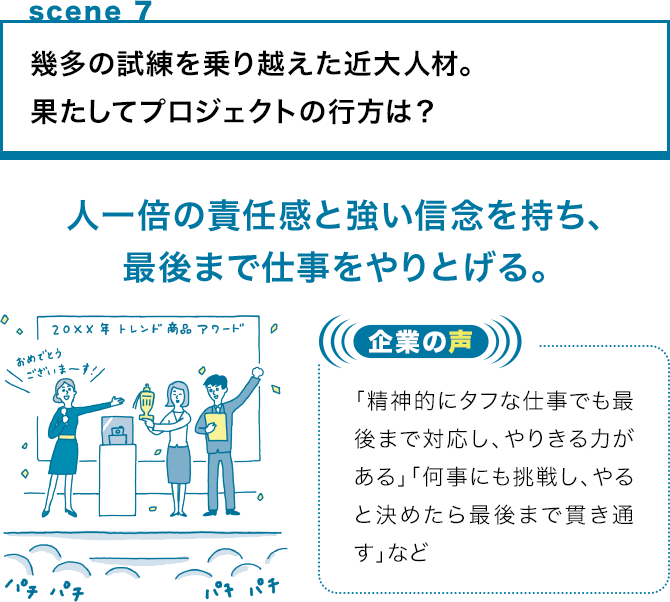 企業の皆様から寄せられた声を分析すると、「答えのないことに立ち向かう積極性」や、「何事にも前向きに粘り強く取り組む姿勢」、「周囲を巻き込み意欲的にする人間力」などに、特に高い評価をいただきました。これらをトータルに表現すれば、ズバリ近大人材の強みは「プロジェクト推進力」だと言えるでしょう。