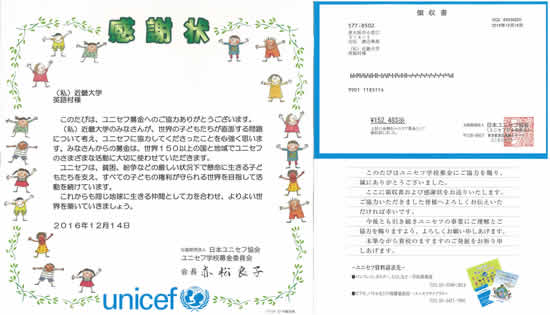 近畿大学英語村E3[e-cube]では、2016年12月13日に開催いたしましたクリスマスチャリティーディナーの参加者からご協力いただいた募金(152,483円)を、財団法人日本ユニセフ協会に送りました。