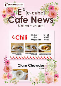 英語村E3[e-cube]カフェでは3月16日(金)まで、チリを販売しています。 キューブバーガーやフレンチフライ、ホットドックと一緒にいかがですか? また、クラムチャウダーも引き続き販売しています。 どうぞご賞味ください♪