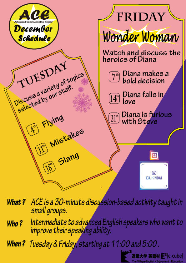 火曜日はさまざまなトピックを用いてディスカッション、金曜日は先月に引き続き、映画"Wonder Woman"を鑑賞してディスカッションをします。どうぞお楽しみに!※予約・事前面接、ともに不要です。みなさんのご参加お待ちしております!