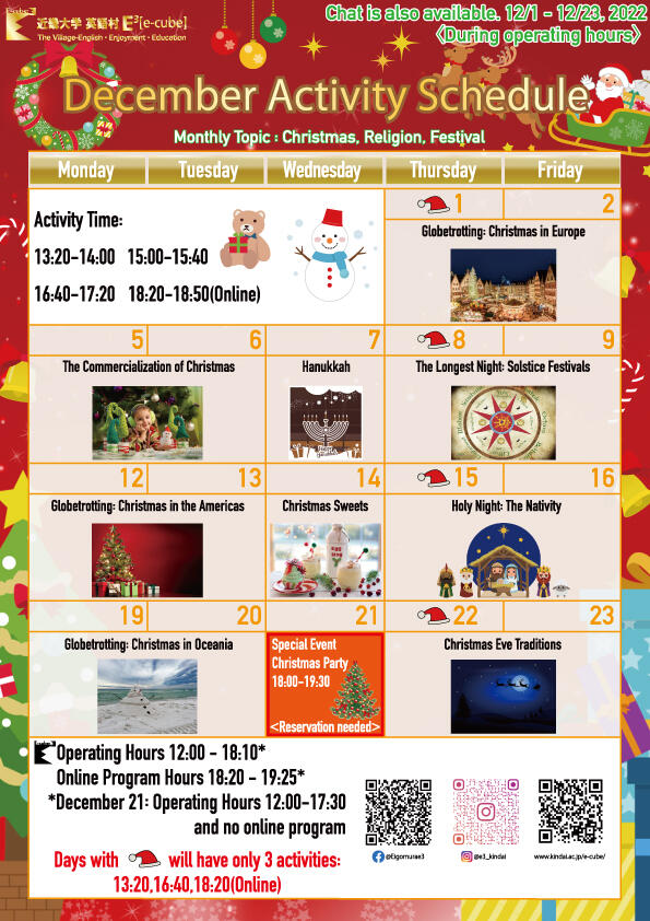 ※12月21日(水)の18:00~19:30にクリスマスパーティーを開催しますので、この日の対面は12:00~17:30まで、夜のオンラインはありません。詳細はアクティビティカレンダーをご確認ください。