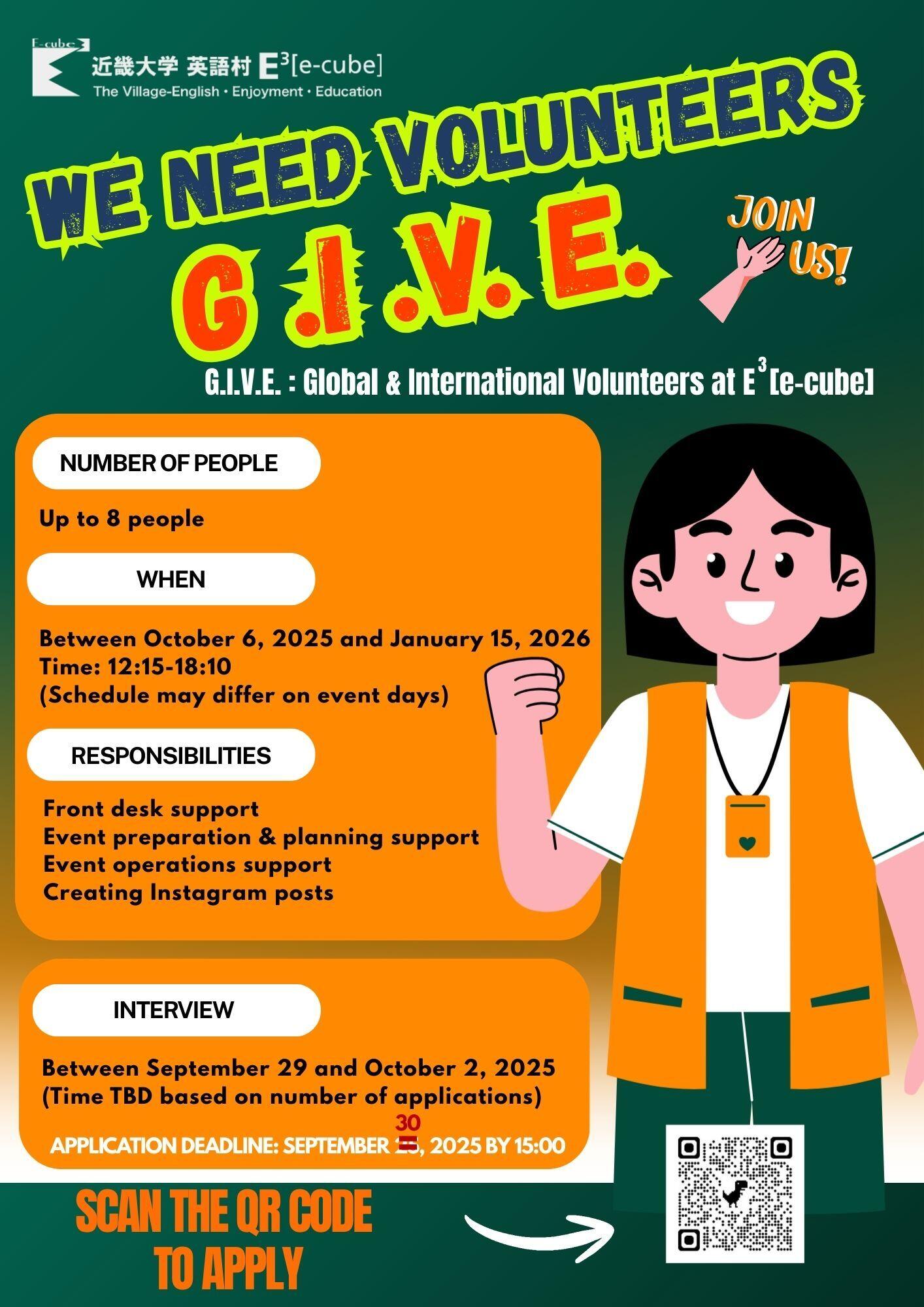 英語村E3 [e-cube]では、一緒に働いていただけるG.I.V.E.ボランティアスタッフを募集します。