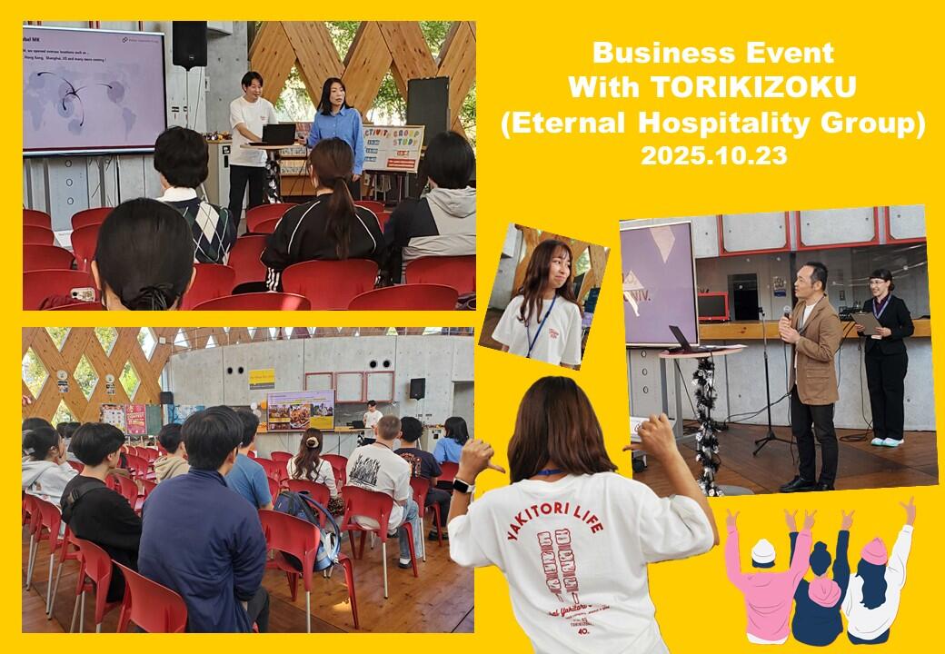 英語村E3 [e-cube] では10月23日(木)に鳥貴族を運営する株式会社エターナルホスピタリティグループの方をお招きしビジネスイベントを開催し、事業内容や海外展開について英語で講演していただきました。海外事業で英語を使うノウハウや心構えなど、英語を使う仕事や海外での仕事に関心を持つ学生にとって、企業の方々から直接お話を伺える貴重な時間となりました。英語を学ぶ上でも、将来のキャリアを考える上でも、大きな刺激を得る機会となったのではないでしょうか。学生・企業双方からの質問を通して良い交流の場となりました。