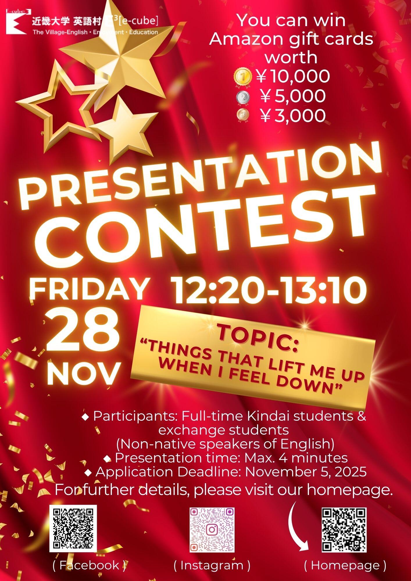 英語村E3 [e-cube] では、11月28日(金)12:20~13:10にプレゼンテーションコンテストを開催します!