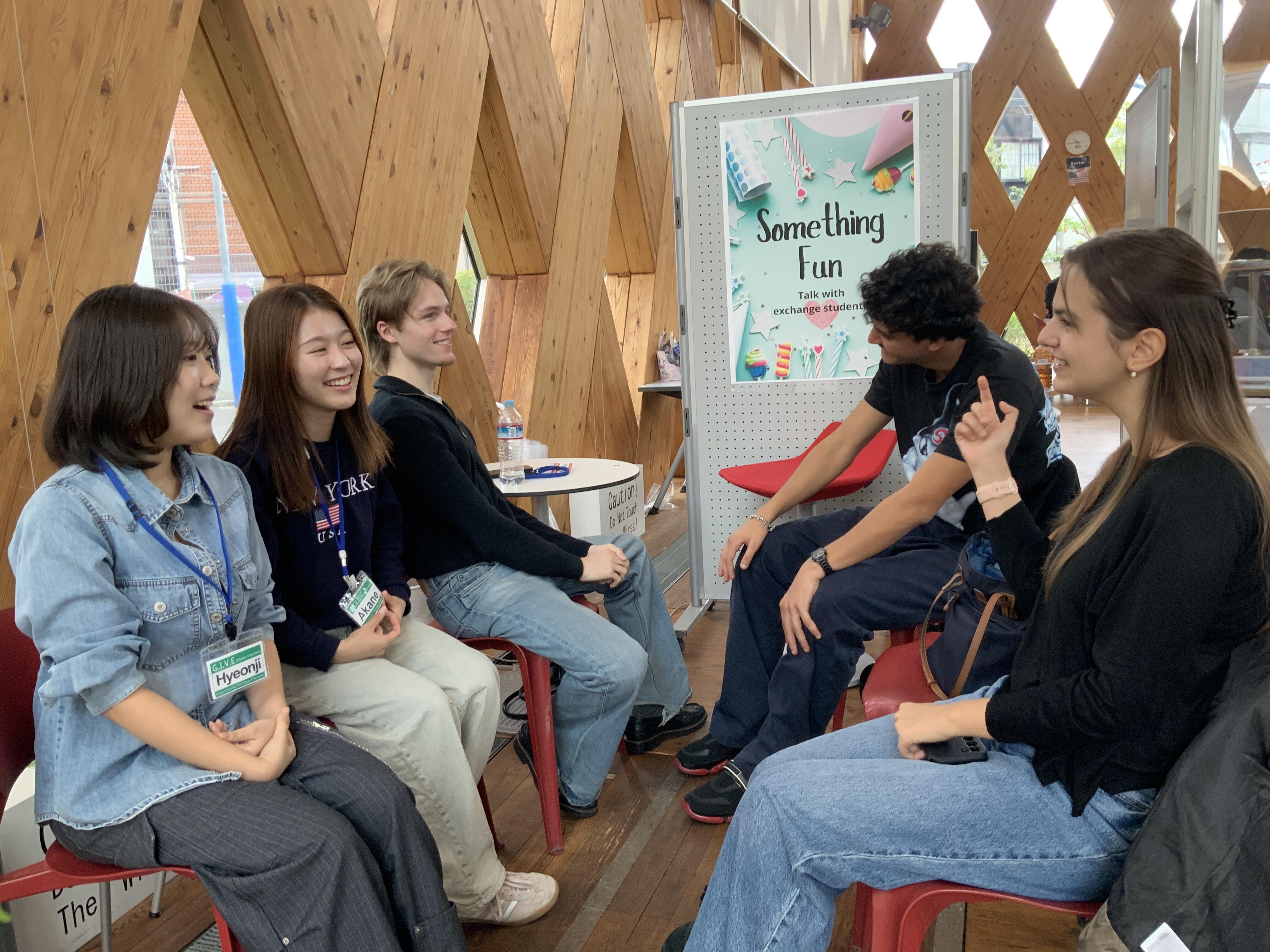 後期はオランダ、インドネシア、チェコ、韓国、ブルガリア、カナダの協定大学からの交換留学生たちがボランティアとして担当しており、気軽に異文化交流を楽しむことができます。