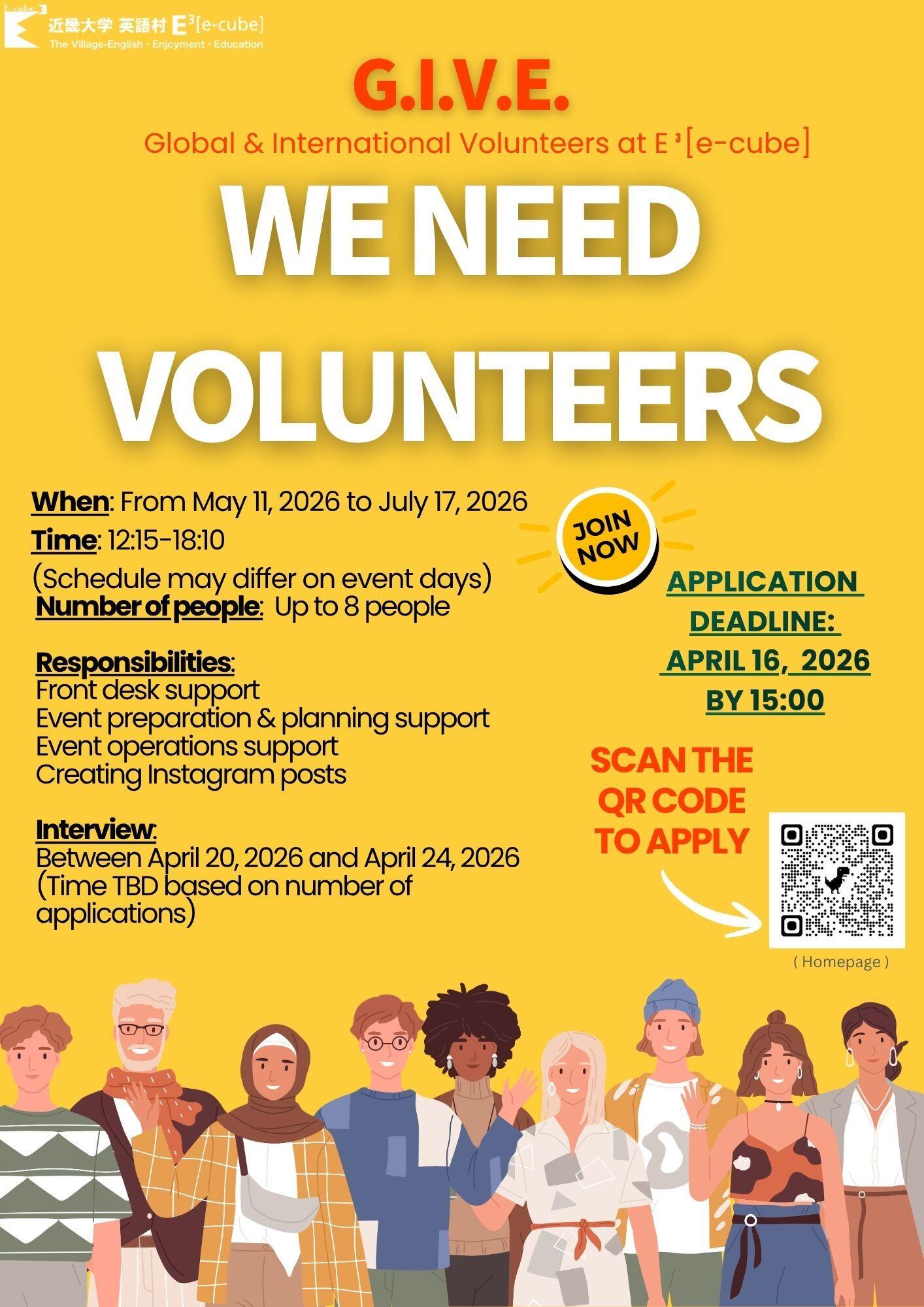 英語村E3 [e-cube] では、一緒に活動していただけるG.I.V.E.ボランティアスタッフを募集します。