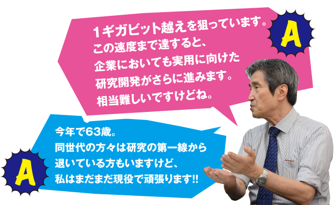 1ギガビット超えを狙っています。この速度まで達すると、企業においても実用に向けた研究開発がさらに進みます。相当難しいですけどね。今年で63歳。同世代の方々は研究の第一線から退いている方もいますけど、私はまだまだ現役で頑張ります!!