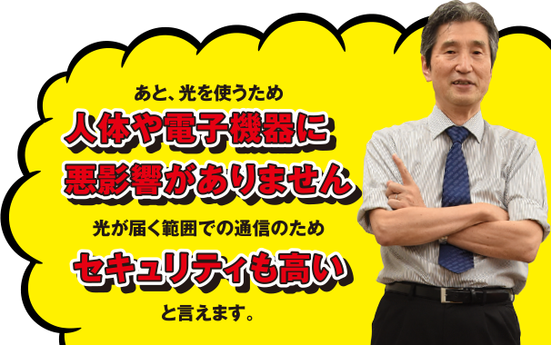 あと、光を使うため人体や電子機器に悪影響がありません 光が届く範囲での通信のためセキュリティも高いと言えます。