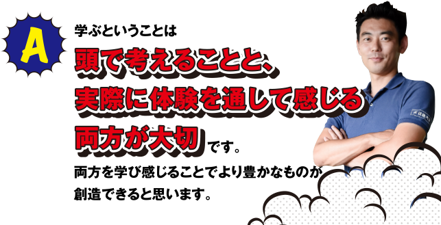 A 学ぶということは頭で考えることと、実際に体験を通じて感じる両方が大切です。両方を学び感じることでより豊かなものが創造できると思います。