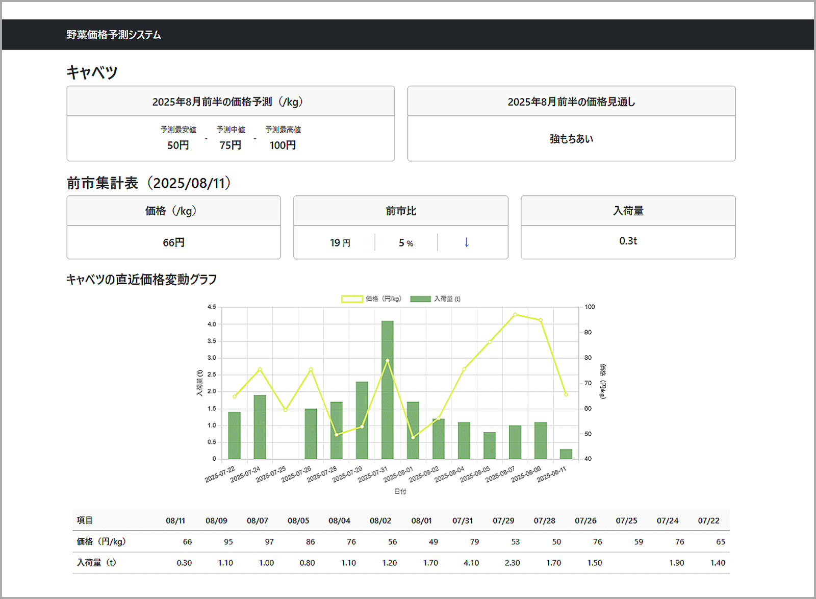 現段階で開発している野菜価格予測システムのデモページです。予測された野菜の価格情報をわかりやすく伝える工夫を行うことにより、地域の生産者のためにより価値のある情報提供を行えるようにしています。