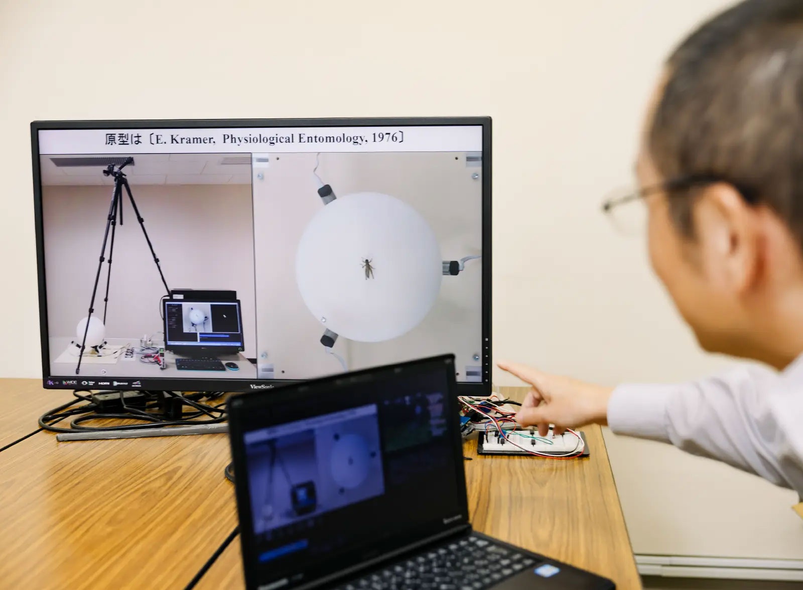 私が参画している研究を二つ紹介します。一つ目は、「コオロギの気流刺激に対する逃避行動分析」です。私が製作した球形トレッドミル装置を用いた行動観察実験によって、コオロギが刺激に対してそのまま逃げるのではなく、一時停止してから逃避するという行動原理を発見しました。一見、生物学寄りな話に聞こえますが、ここにもロボット技術が大きく貢献しています。刺激に対する応答を観察するには、刺激装置とコオロギの相対的な位置・姿勢を、常に一定の値に保つ必要があります。これが一定でない場合は、刺激の強さや方向がバラバラになってしまい、刺激応答のデータを正しく取得できません。当然コオロギは勝手に動き回りますので、何もしなければ刺激装置とコオロギの相対的な位置・姿勢を一定の値に保つことはできません。そこで開発したのが、トレッドミル(ルームランナー)を二次元に拡張したもので、コオロギの乗る球をコオロギの動きと逆方向に回転させる球型トレッドミル装置です。これにより初めて、「刺激装置とコオロギの相対的な位置・姿勢を常に一定の値に保つ」ことができ、刺激に対する応答を正しく観察できるようになりました。