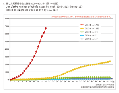 風疹の流行が全国的に見られており、特に首都圏や関西地方で感染が拡がっています。国立感染症研究所の発生動向調査では、5月15日の時点で、全国で約6,725人の患者数が報告されており、既に昨年1年間の報告数の2倍を軽く超えた数になっています。