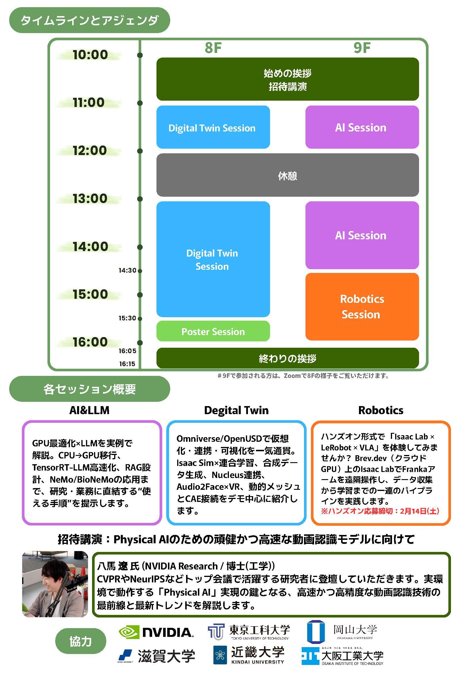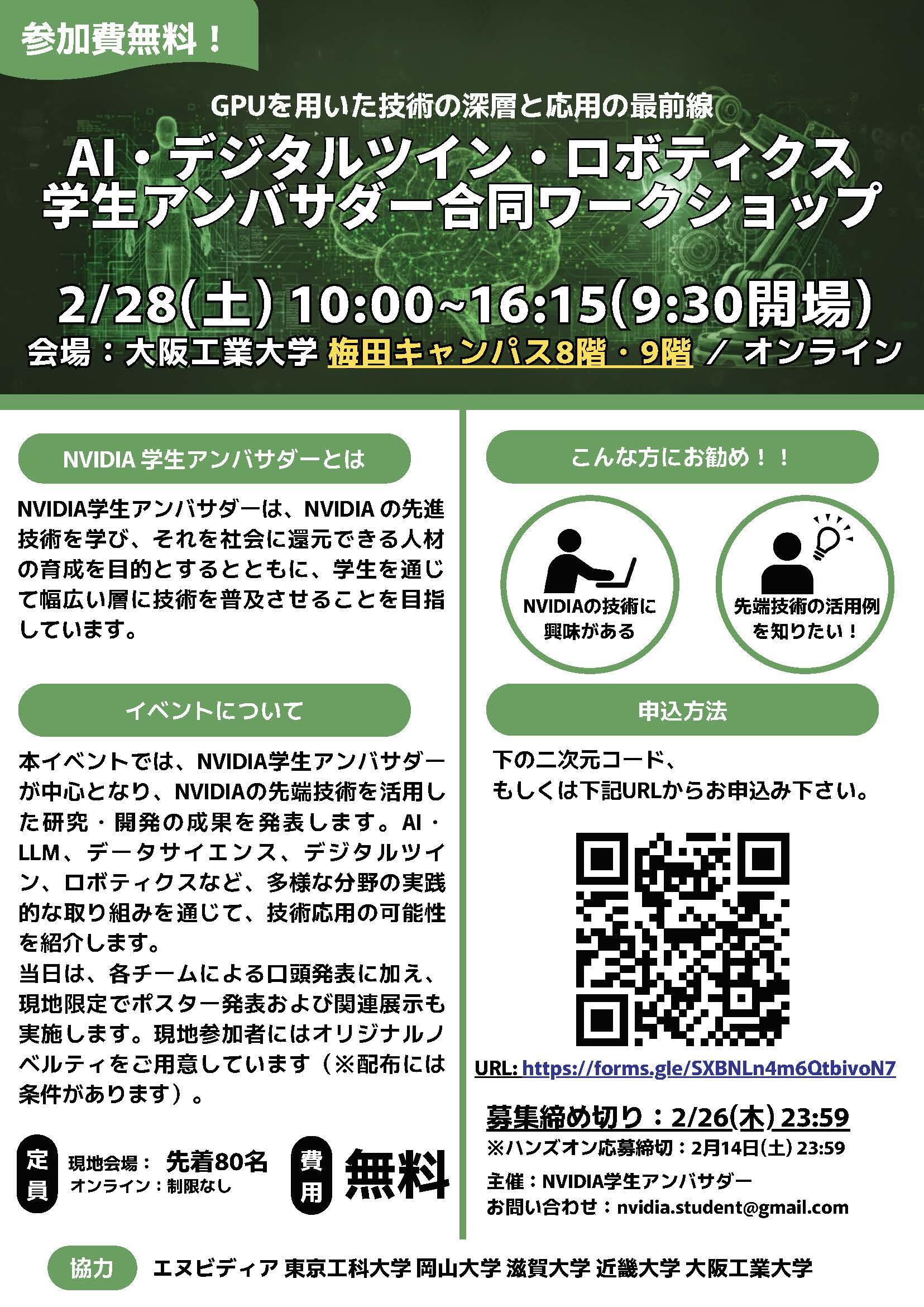 近畿大学情報学部にNVIDIA学生アンバサダーが2名在籍しており、2月28日(土)に「GPUを用いた技術の深層と応用の最前線:AI・デジタルツイン・ロボティクス学生アンバサダー合同ワークショップ」を開催することになりましたのでお知らせいたします。