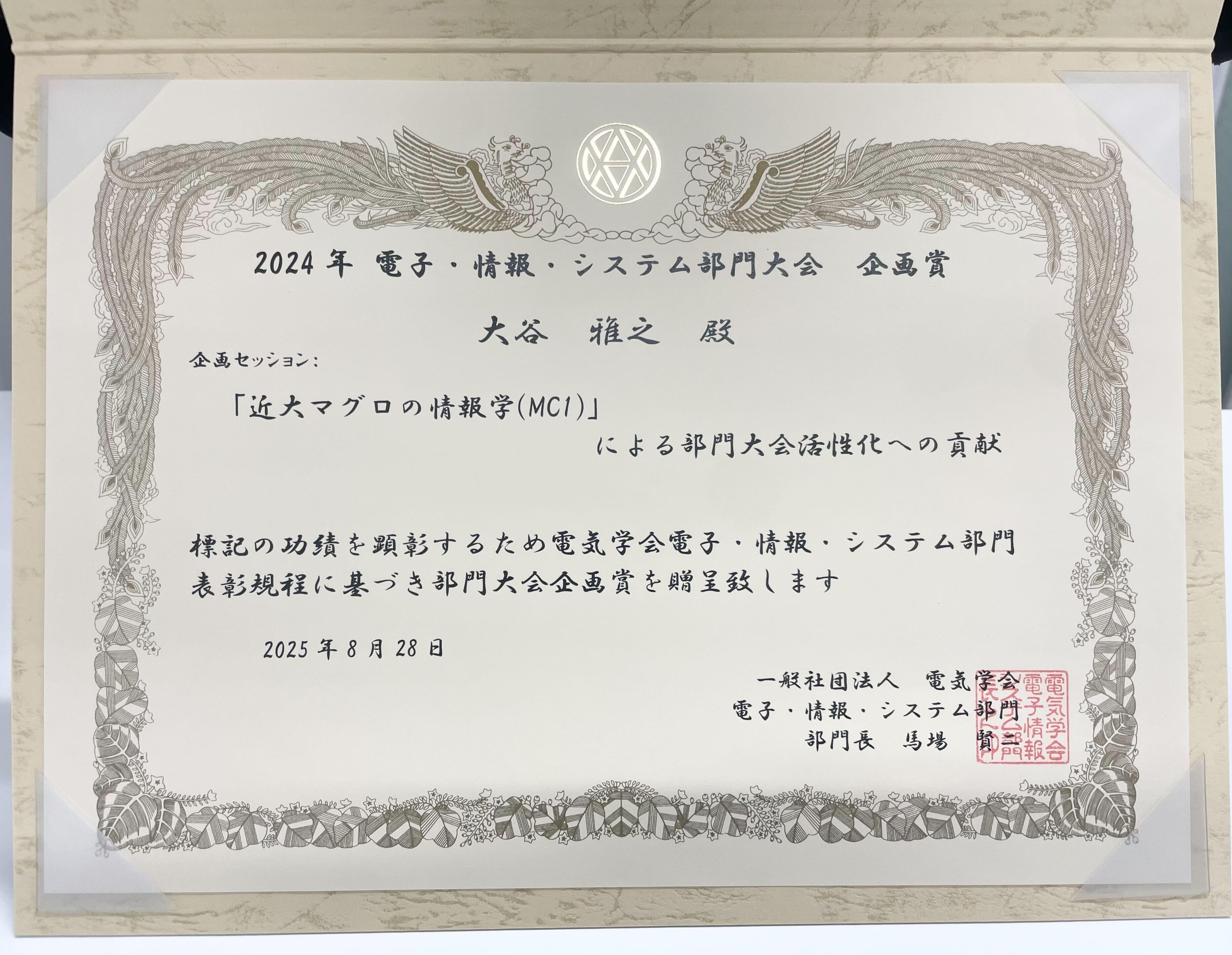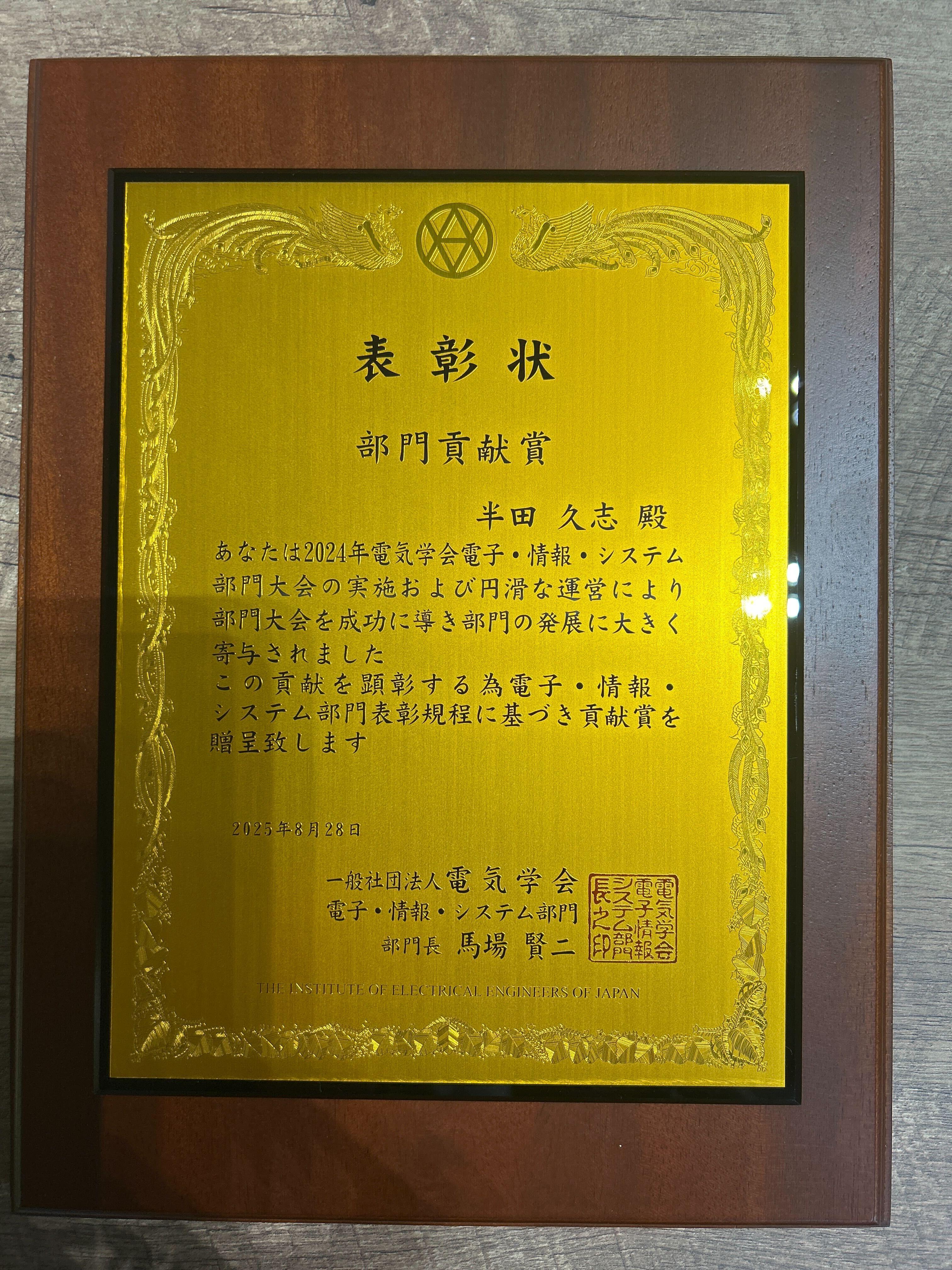 2024年9月4日から9月7日に開催された2024年 電気学会 電子・情報・システム部門大会において、情報学部・情報学科 半田 久志 教授が「部門貢献賞」、大谷 雅之 講師が「企画賞」、また、情報学部教員の指導学生が「奨励賞」を受賞し、2025年8月28日の 2025年 電気学会 電子・情報・システム部門大会にて、表彰状の授与式がありました。