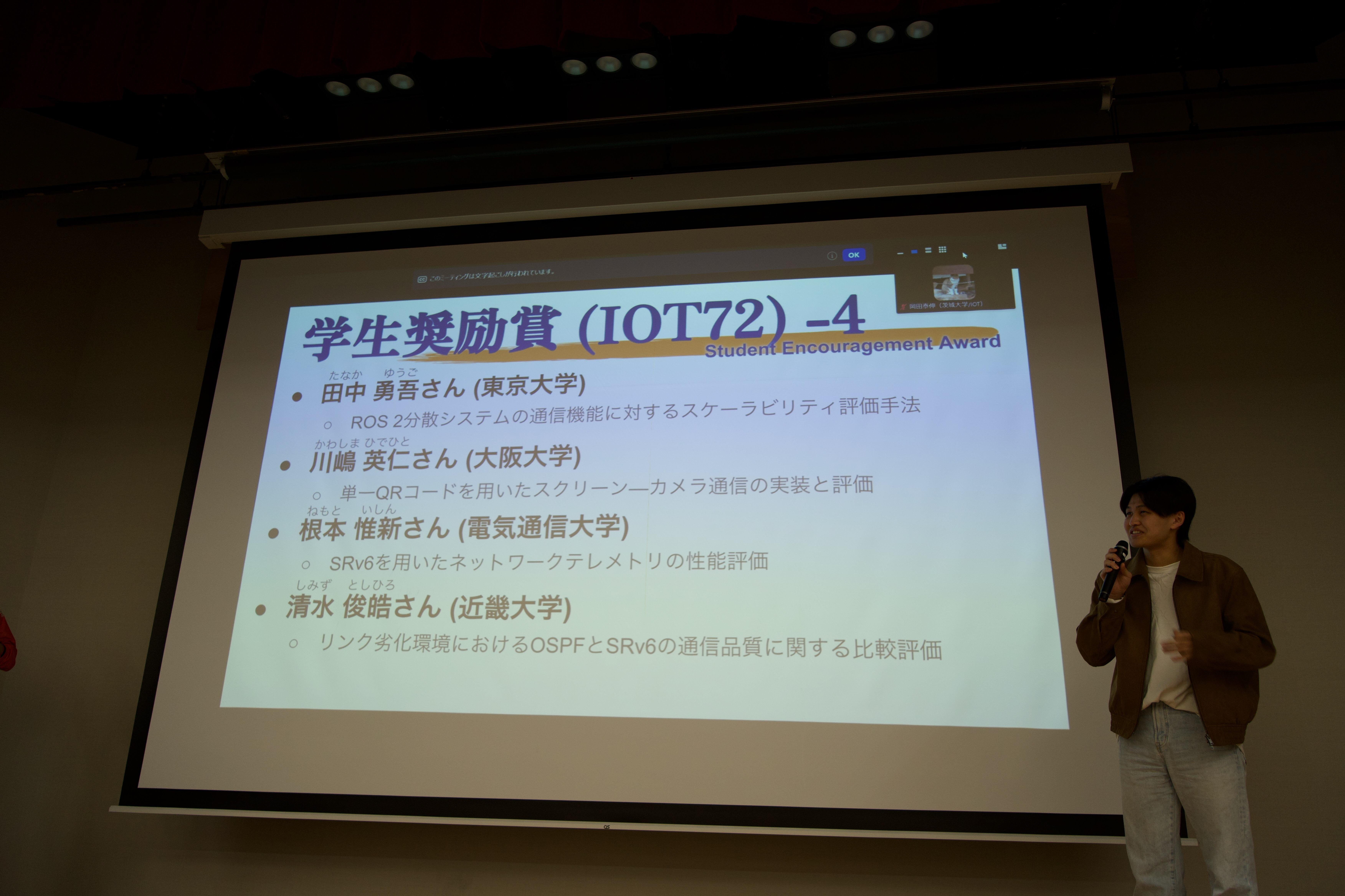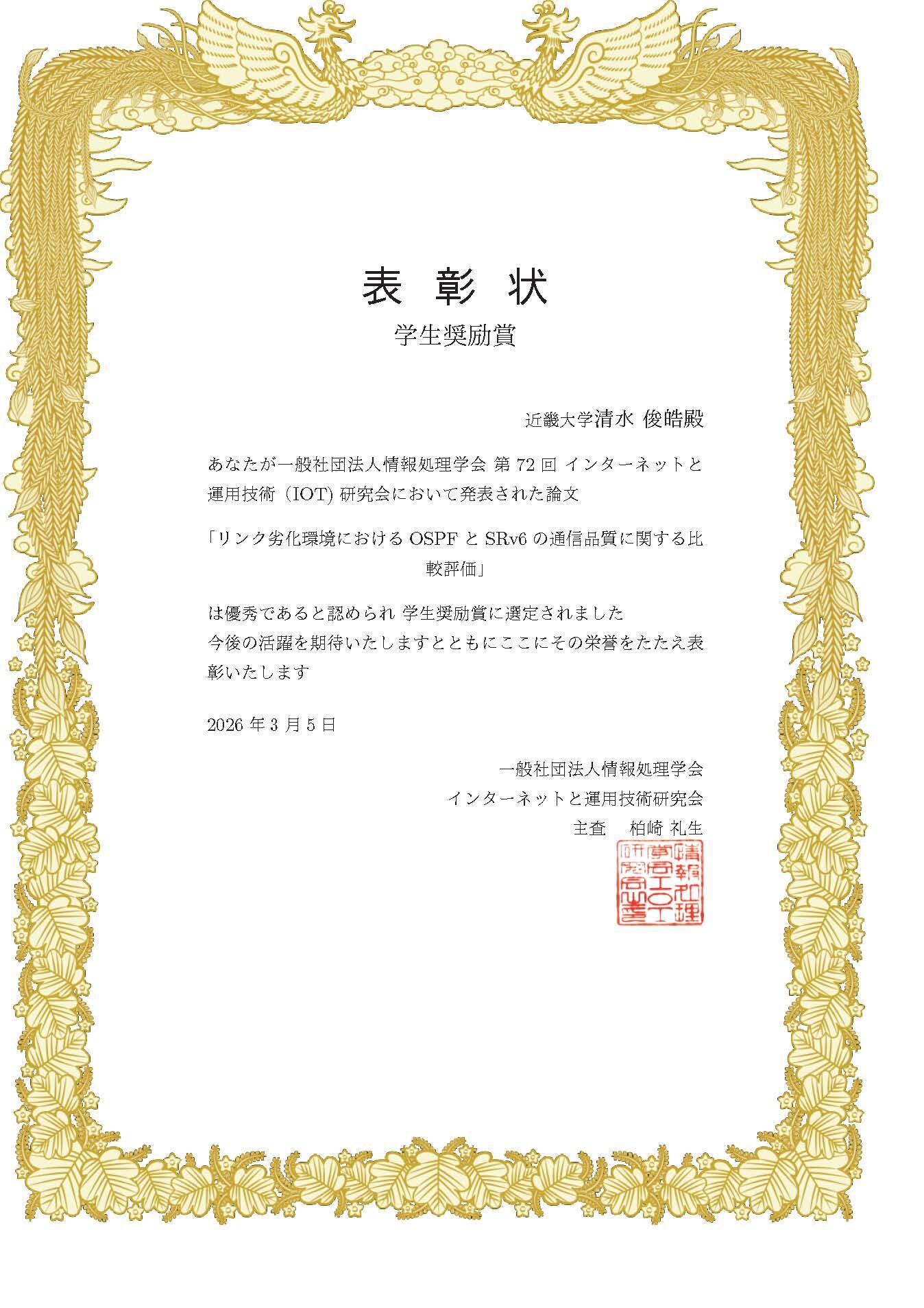 2026年3月3~5日に沖縄産業支援センターで開催された第72回IOT研究会において、情報学部教員の指導学生が学生奨励賞を受賞しました。