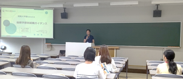 2024年10月2日(水)の5限目(アセンブリアワー)に、短期大学部の1 年生を対象とした就職ガイダンスを21号館5階の535教室で行いました。