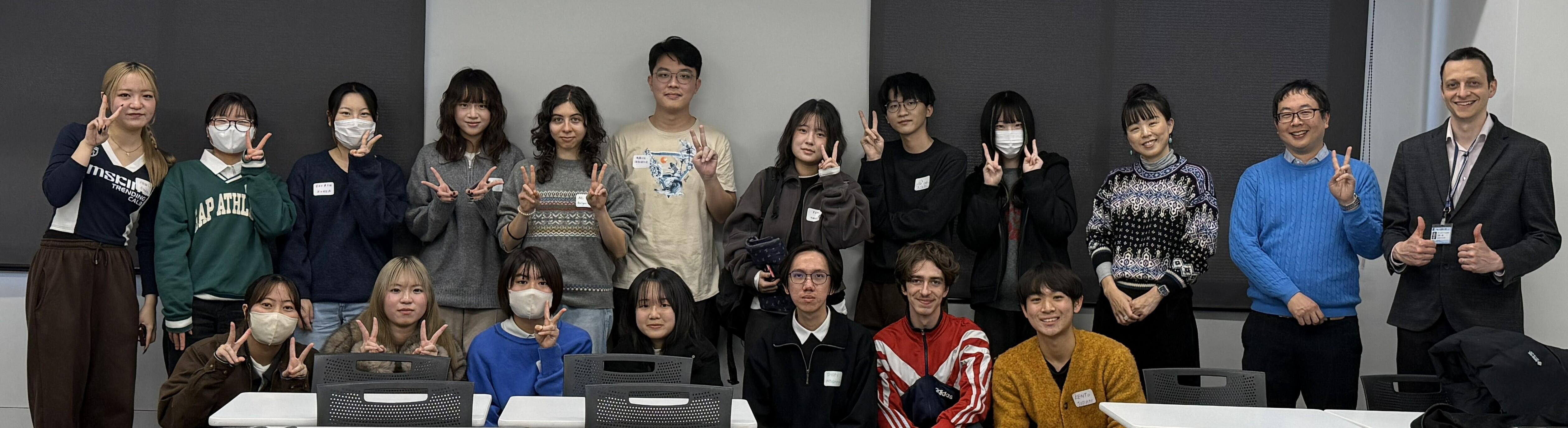 2025年12月11日、国際コースの山本兼督さん(法学部3年生)と趙秀彬さん(法学部3年生)を中心に、留学生との交流会が開催されました。国際コースから10名、留学生7名の計17名が参加し、終始にぎやかな雰囲気で交流が進みました。