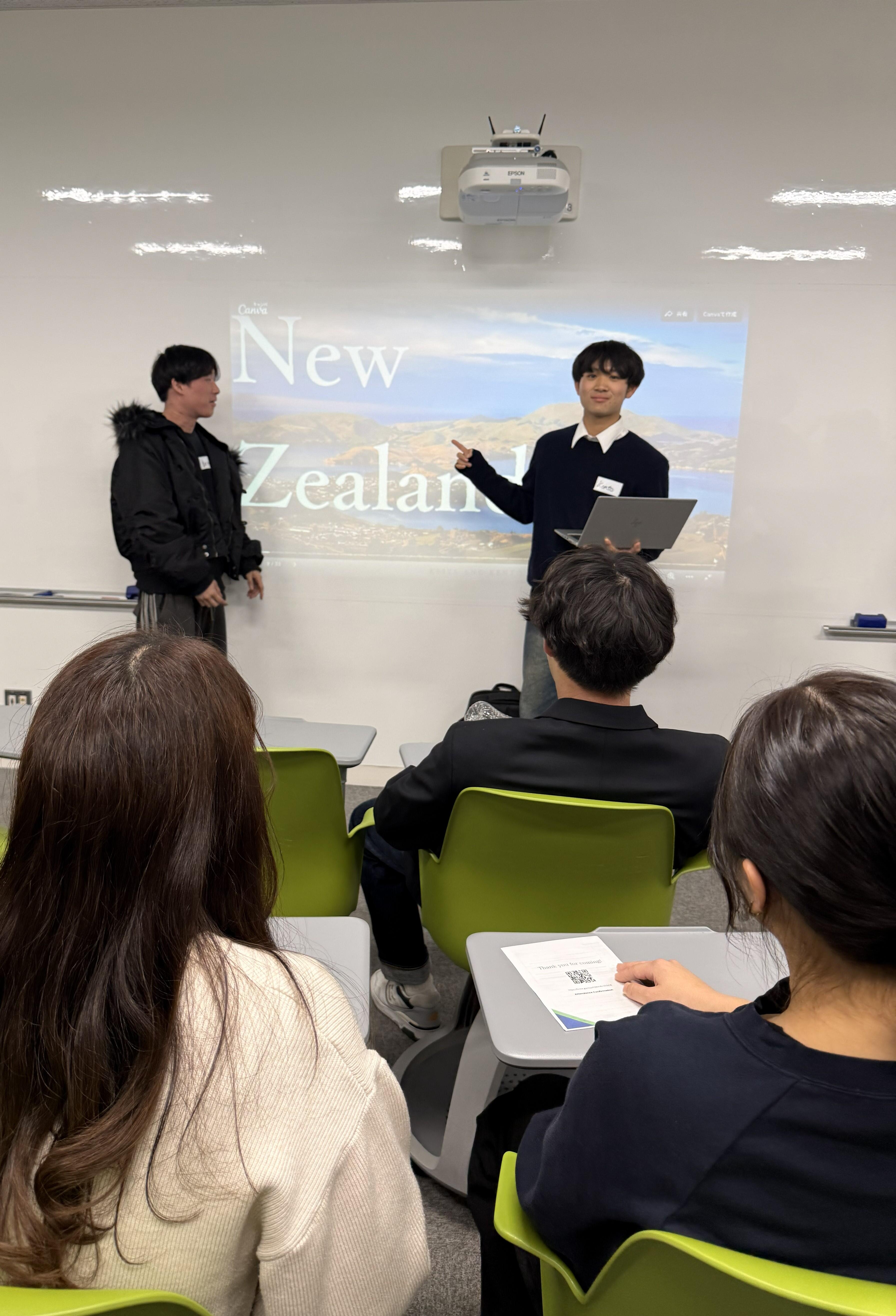 本学からは、森慧哉さん(法学部国際コース4年生、出口ゼミ)と山本兼督さん(法学部国際コース3年生、森山ゼミ)が、LPC留学プログラムにおけるニュージーランド留学の体験について報告しました。