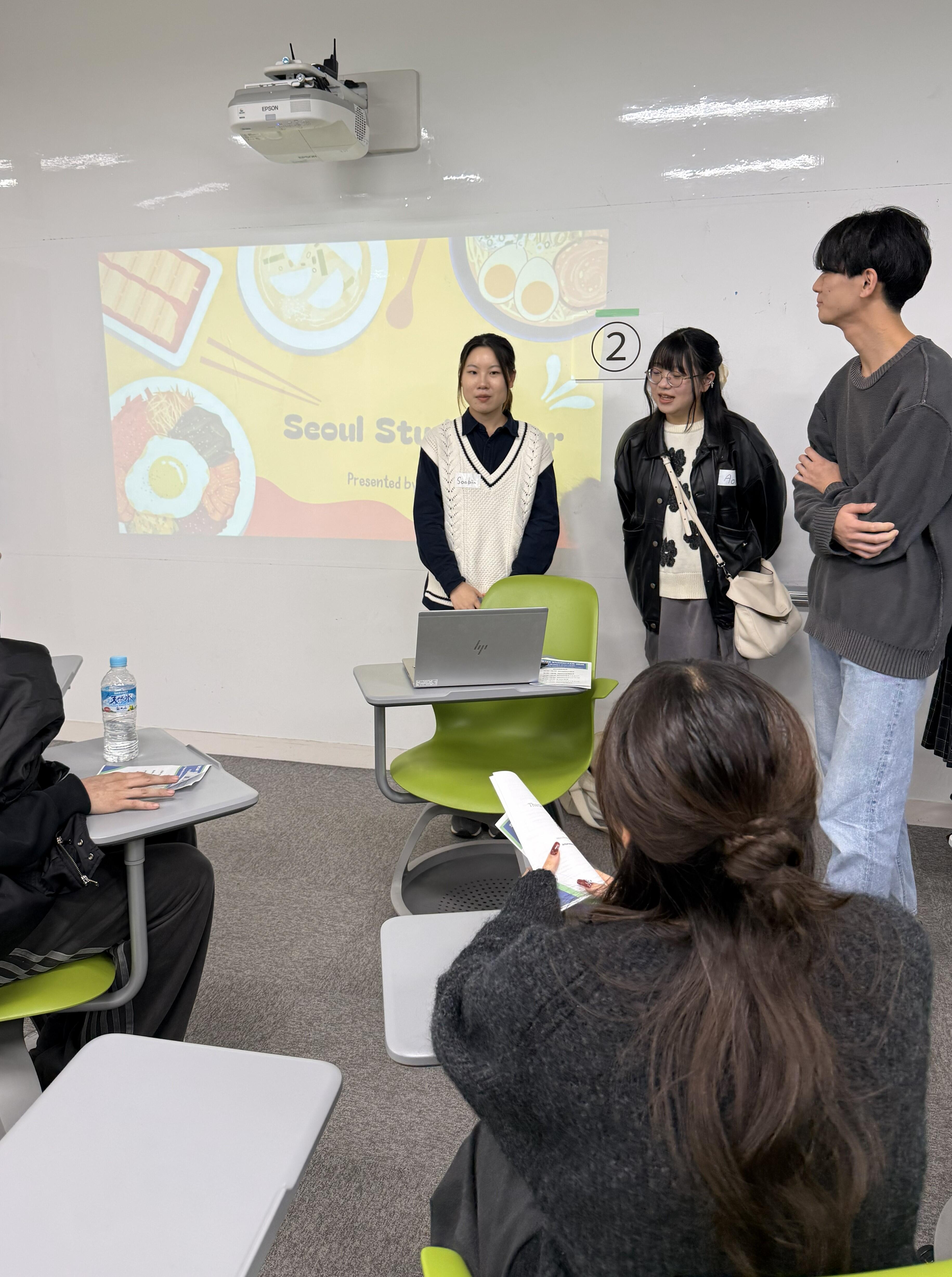 また、吉本葵さん(法学部4年生、出口ゼミ)、井戸本孝太さん(法学部4年生、出口ゼミ)、趙秀彬さん(法学部国際コース3年生、出口ゼミ)は、韓国で実施したゼミ・スタディツアーの学びについて発表し、現地での交流や気づき、今後の学習への展望を交えて紹介しました。