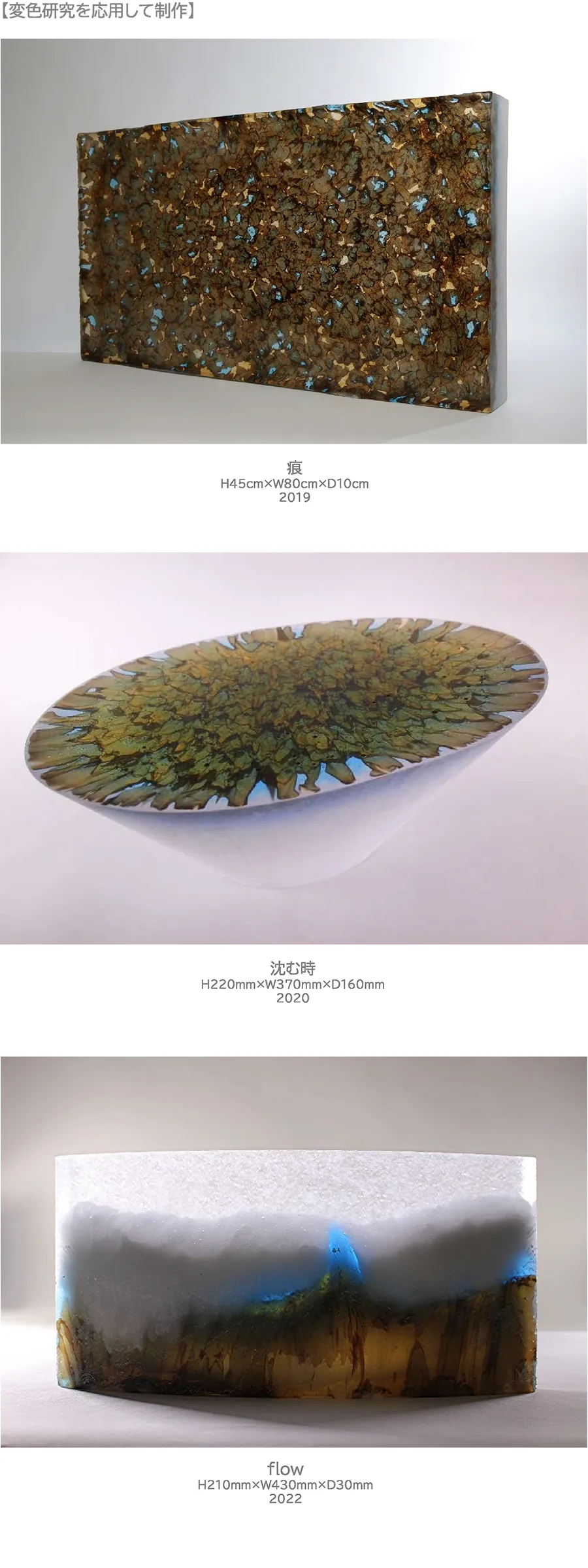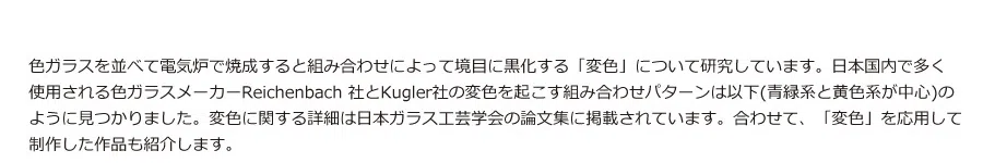 | コメント | ガラス素材の特性を生かした造形作品制作と色ガラスの変色研究をしています。 |