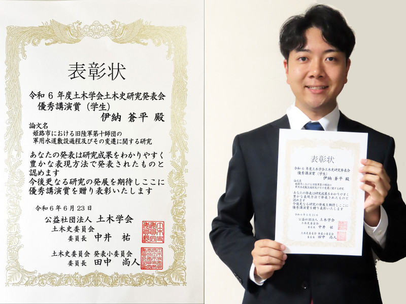 2024年6月22日(土)に名城大学で開催された令和6年度土木学会土木史研究発表会で、景観工学研究室M1(現M2)の伊納蒼平君が「優秀講演賞」を受賞しました。おめでとうございます!