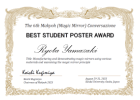 山崎亮太さんがThe 6th Makyoh (Magic Mirror) Conversazione (第6回国際魔鏡懇話会) でBest Student Poster Awardを受賞