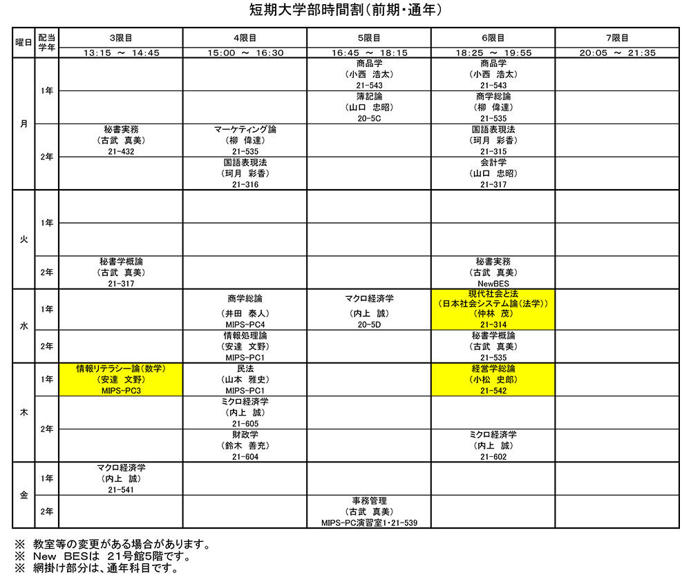 - 通学部の時間割調整により、休講・補講・試験の日程については、通学課程に合わせて実施するため曜日・講師等が変更される場合があります。あらかじめご了承ください。